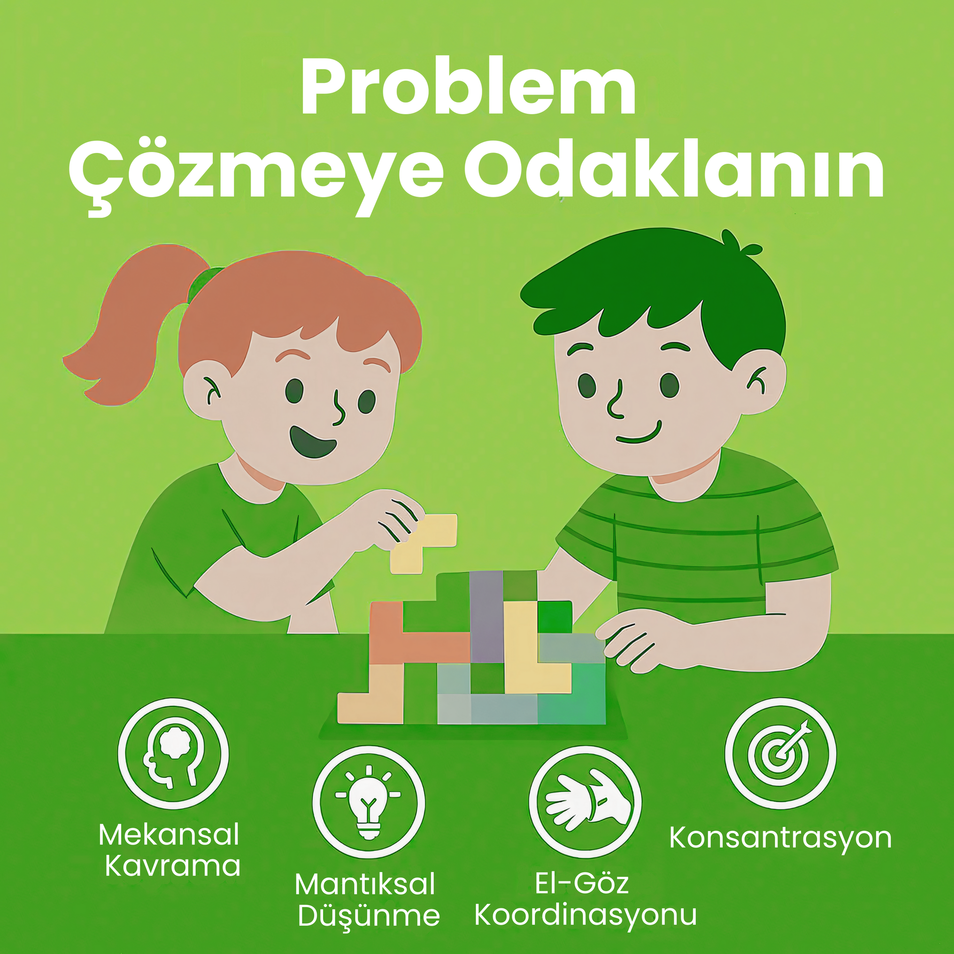 Çocuklar parçaları birleştirirken sadece oyun oynamıyor, aynı zamanda problem çözme ve yaratıcılık becerilerini de geliştiriyor. Her deneme, onları yeni çözümler keşfetmeye ve düşüncelerini farklı yollarla ifade etmeye teşvik ediyor.