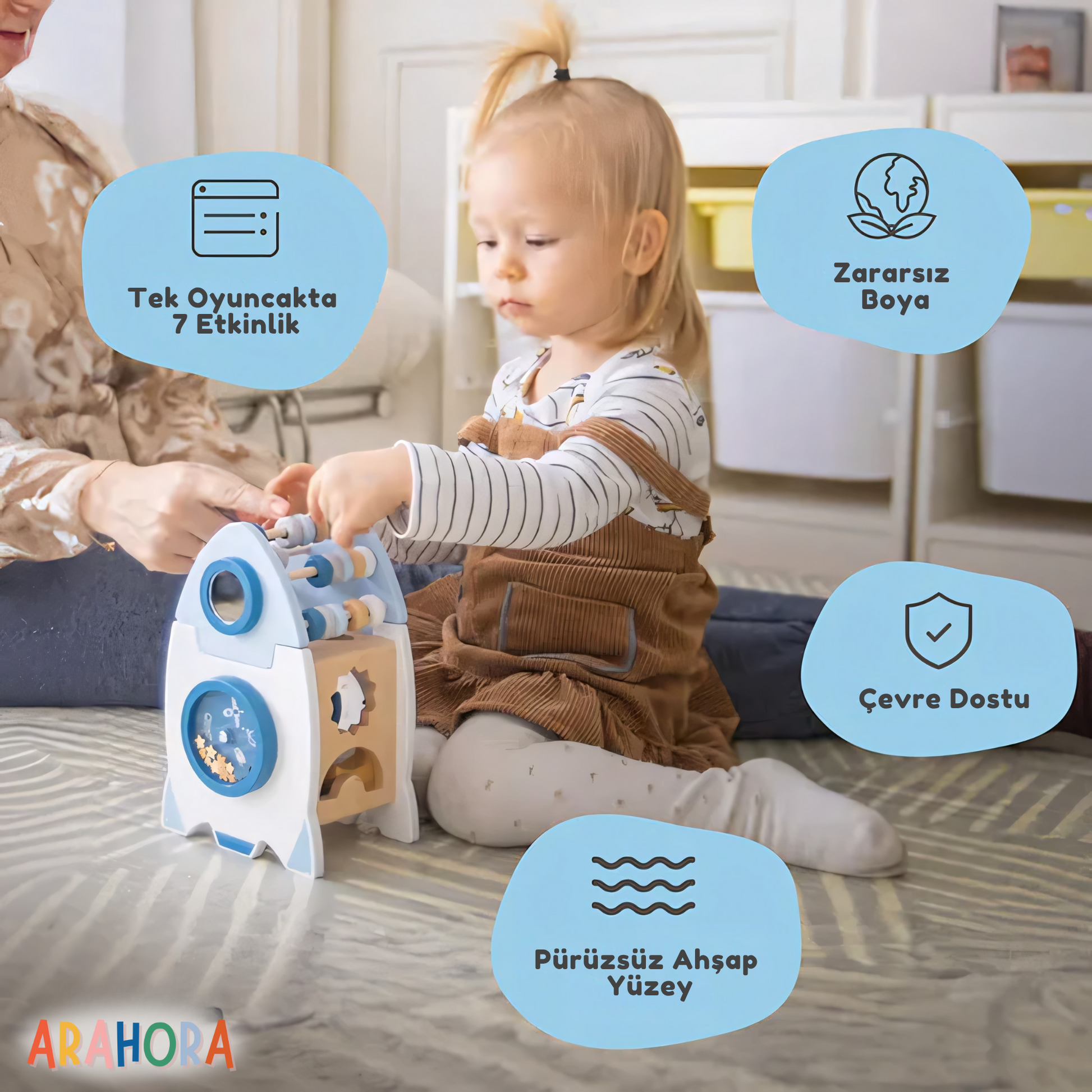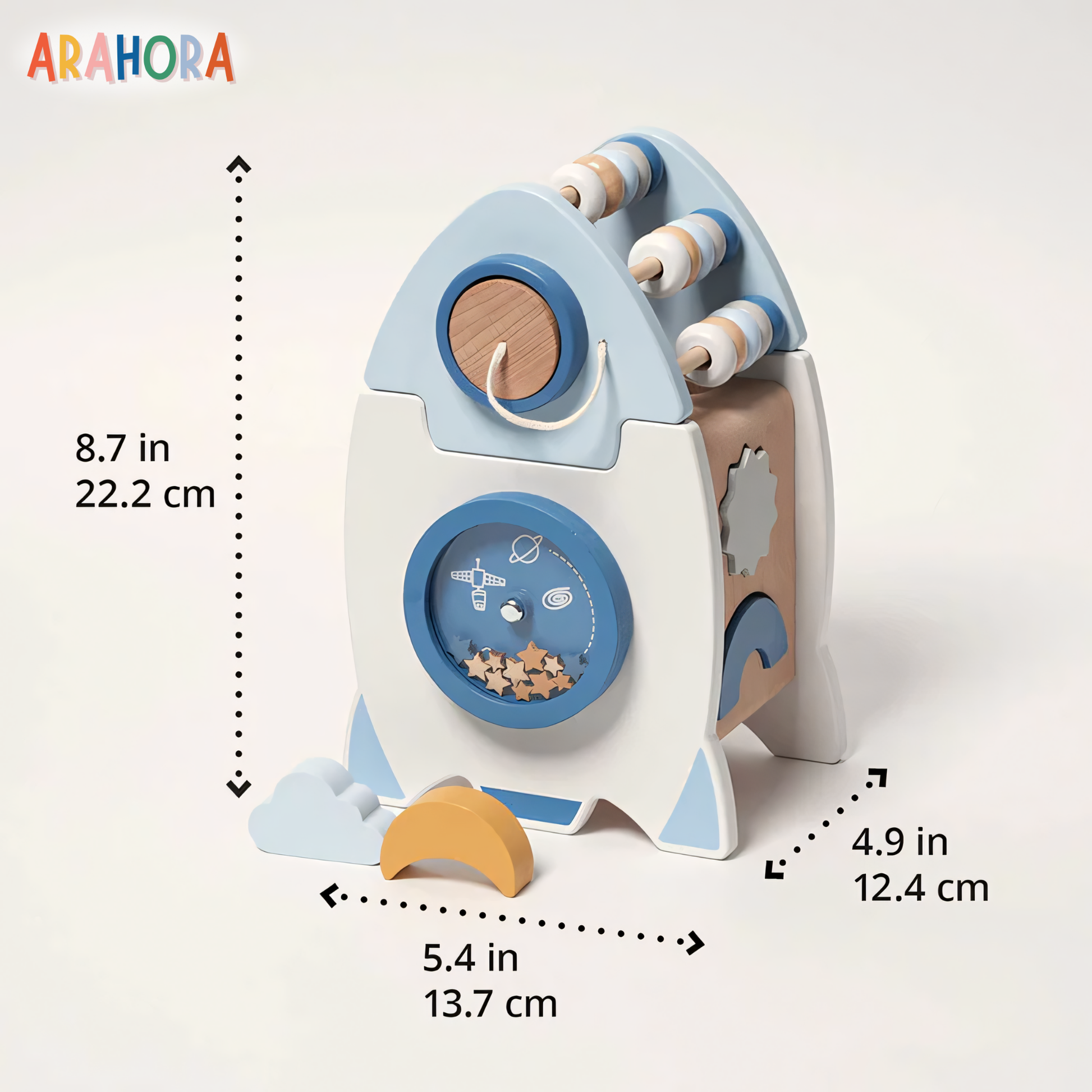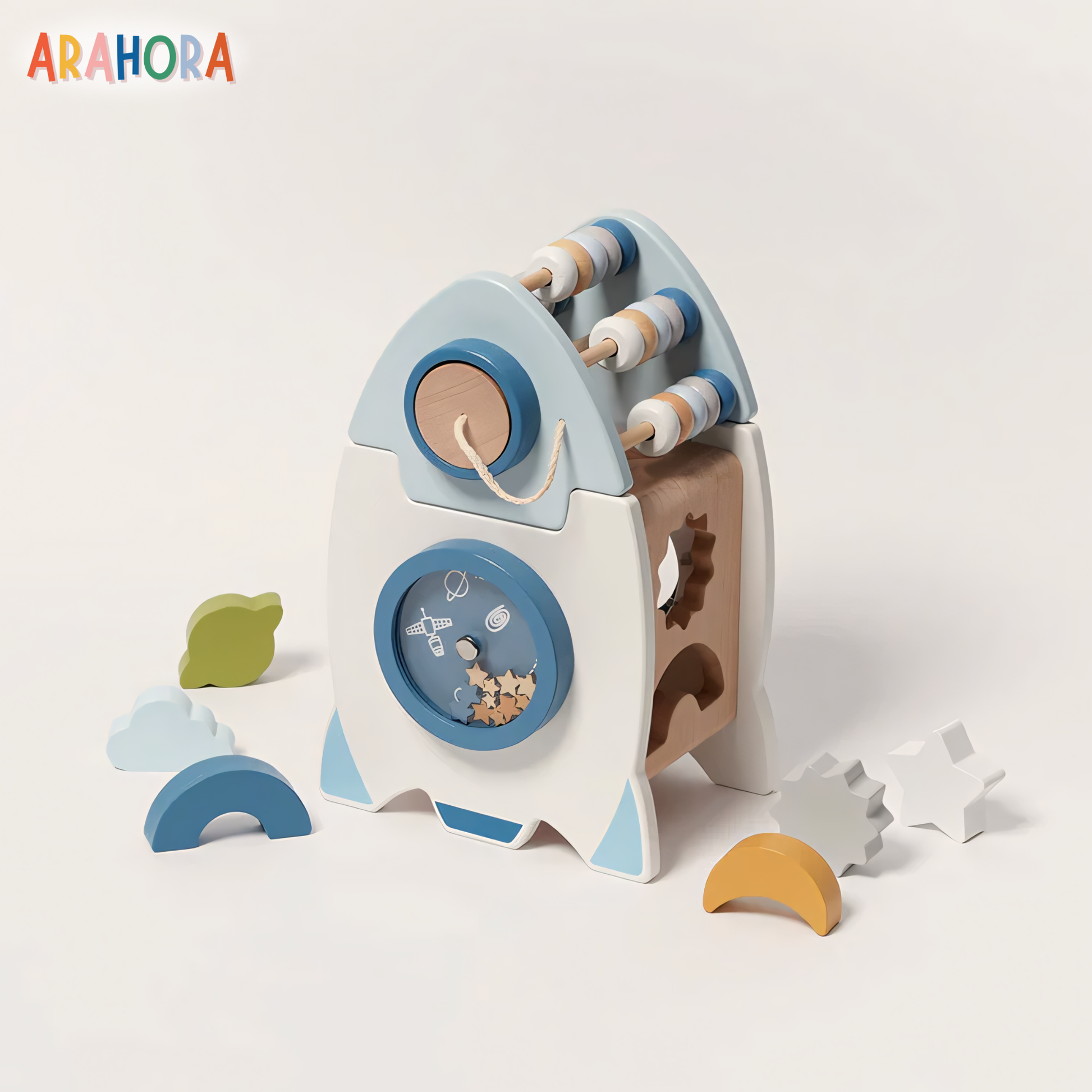 Ahşap roket formundaki bu oyuncak, şekil eşleştirme ve abaküs ile sayma becerilerini bir araya getirir. Çocuklar bulutları, yıldızları ve ayı yerleştirirken hem eğlenir hem öğrenir. Uzay temalı tasarımıyla minik kaşiflerin favorisi olur.